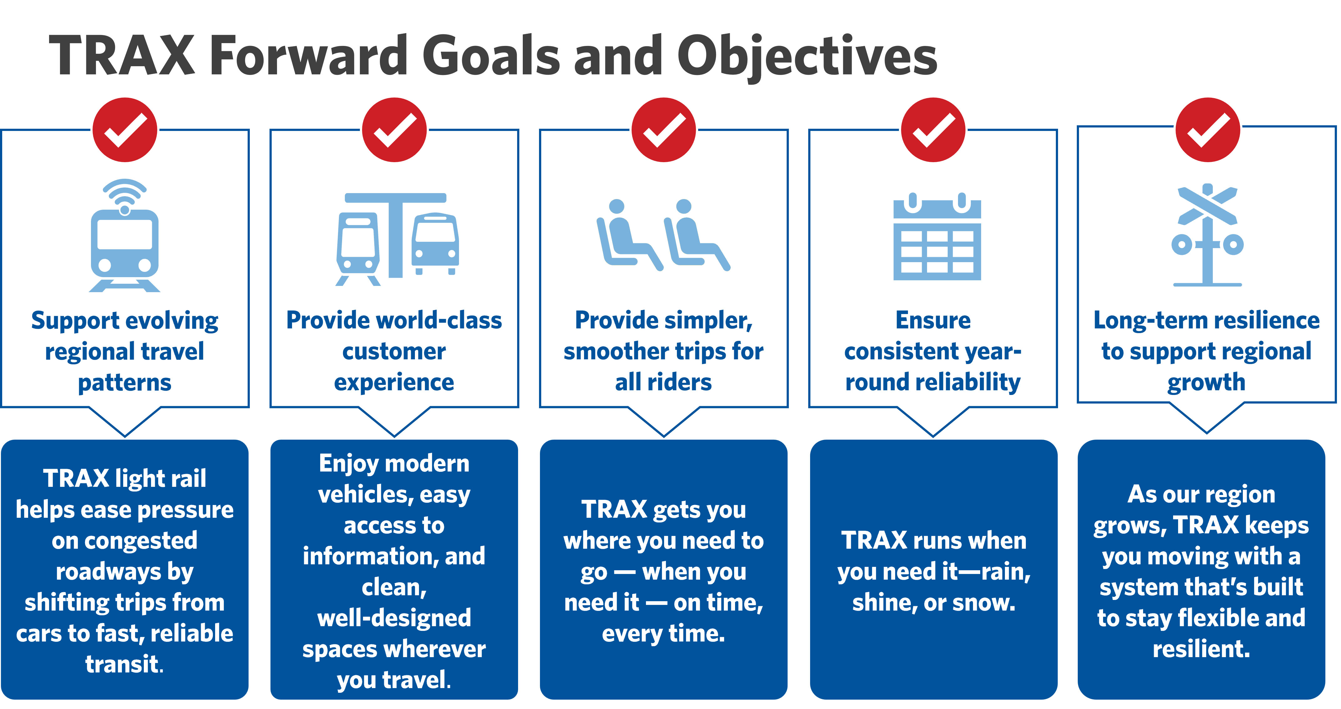 TRAX Forward is a unified program that modernizes the TRAX system through targeted investments, improving reliability, resiliency, and the customer experience to meet changing travel needs and technology.